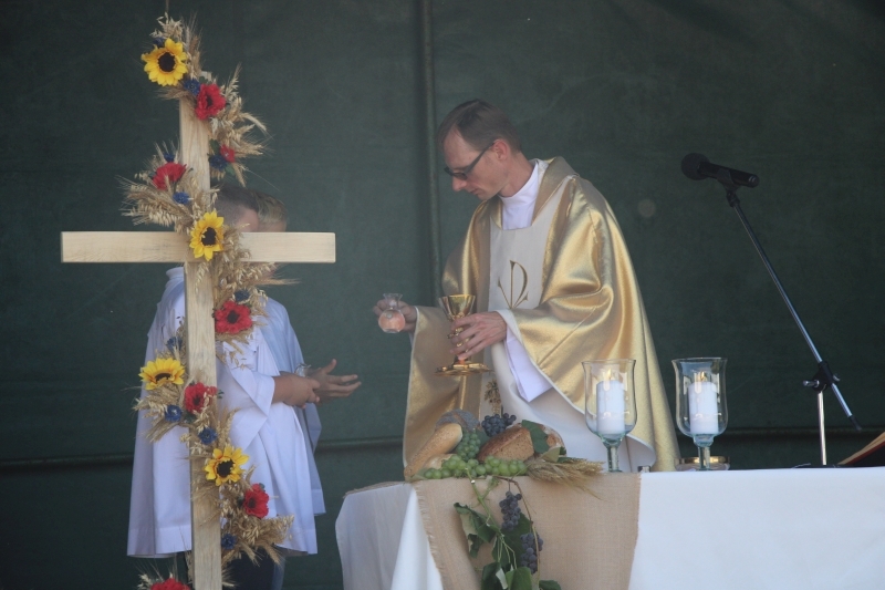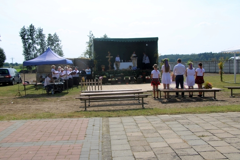 Jezierzyckie święto plonów otworzyła w tym roku polowa msza święta dziękczynna za żniwa, którą odprawił ksiądz proboszcz Andrzej Pajzderski. Wśród jej uczestników obecni byli m.in.: wójt gminy Włoszakowice Robert Kasperczak, radna gminy Hanna Michalska, sołtys wsi Agnieszka Przewoźna, prezes Banku Spółdzielczego we Włoszakowicach Dorota Grygiel oraz przedstawiciele lokalnych instytucji i organizacji. W trakcie nabożeństwa delegacja reprezentująca okolicznych producentów żywności złożyła na ołtarzu wieniec dożynkowy, chleb upieczony z tegorocznej mąki oraz kosz wypełniony owocami. Liturgię uświetniły swymi śpiewami panie z tutejszego Zespołu Śpiewaczego „Jezioranki”, występujące pod dyrekcją Marioli Jagodzik.